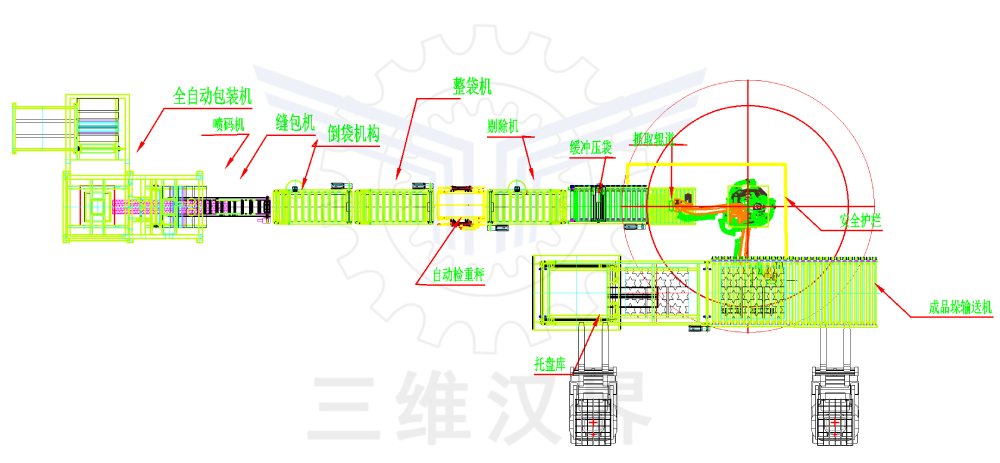 全自動碼垛設備具有碼放速度快、垛型整齊、自動化水平高的特點。主要由包裝袋壓平整理、緩沖輸送機、抓取輥道、托盤庫、機械手等裝置組成。整套設備動作準確、可靠、維護方便、節(jié)約人力成本,提高自動化水平。