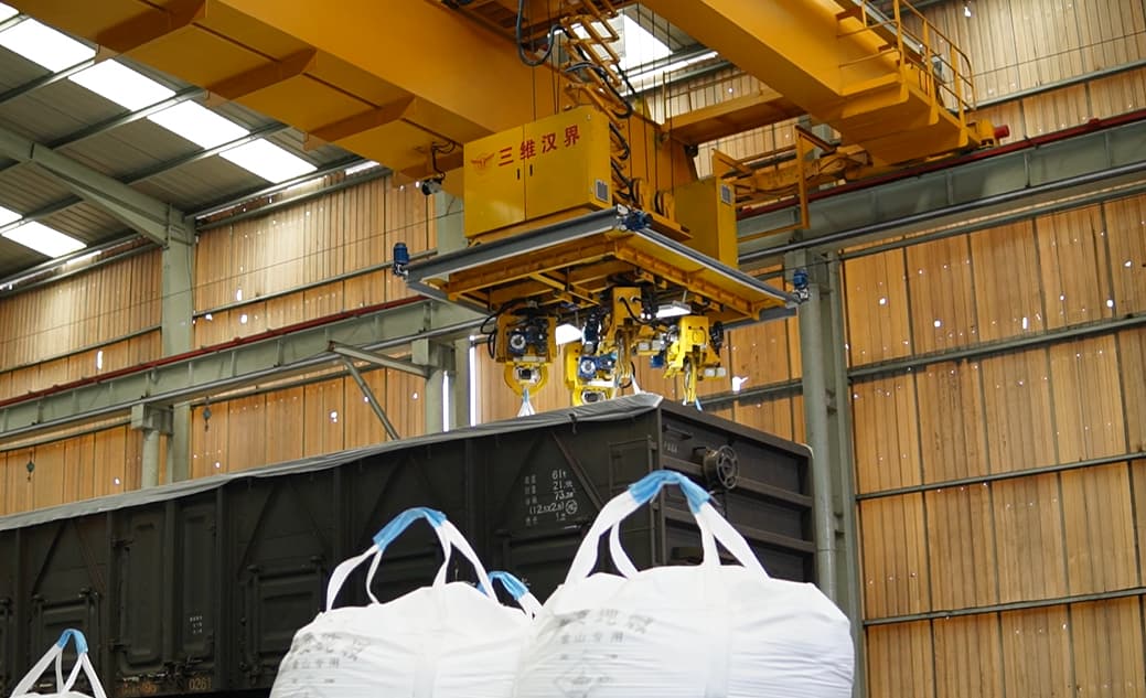 - 機械執(zhí)行:輸送機將噸袋送至抓取工位,吊裝系統(tǒng)按預設程序精準抓取并碼放至車廂指定位置,叉齒設計可保護噸袋并整形垛型。